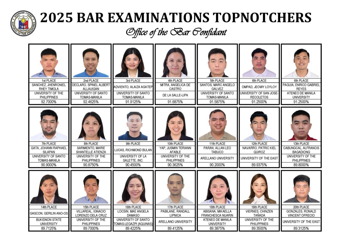 Jhenroniel Rhey Timola Sanchez, a graduate of the University of the Philippines, clinched the top spot in the 2025 Bar examinations with an overall rating of 92.70%.