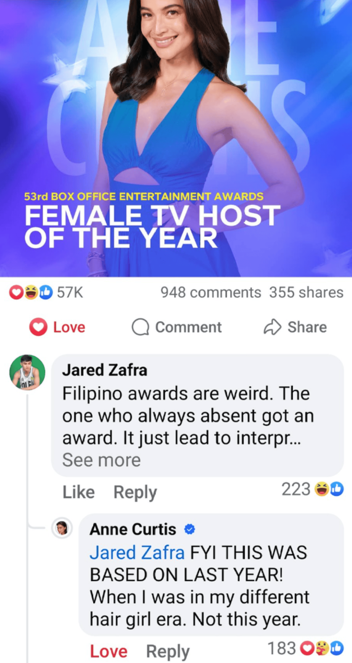Anne Curtis responded to criticism on social media regarding her recent hosting award at the 53rd Box Office Entertainment Awards.