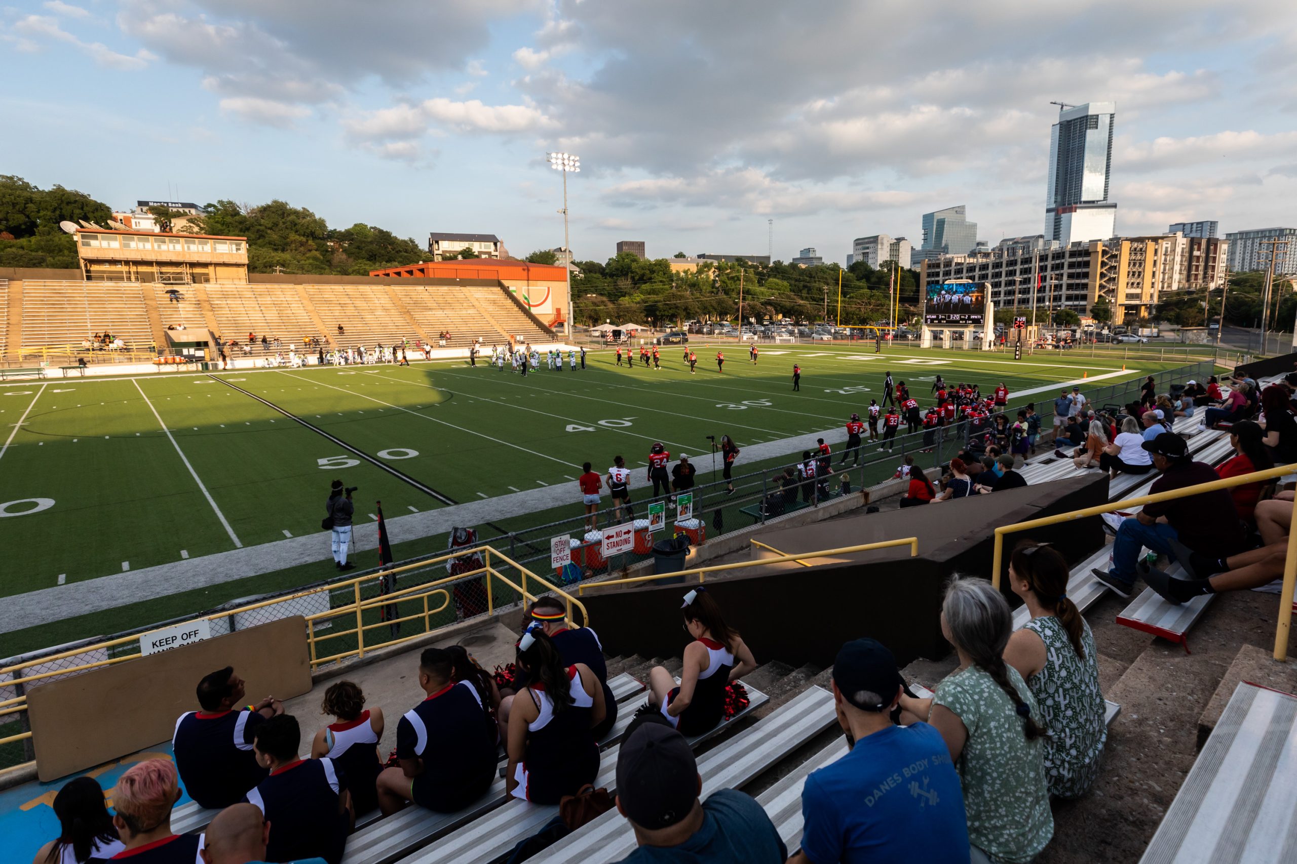Fans and the Cheer Austin squad watch the Austin Outlaws take on Arlington Impact on May 20, 2023, at House Park Stadium in Austin. Michael Minasi / KUT