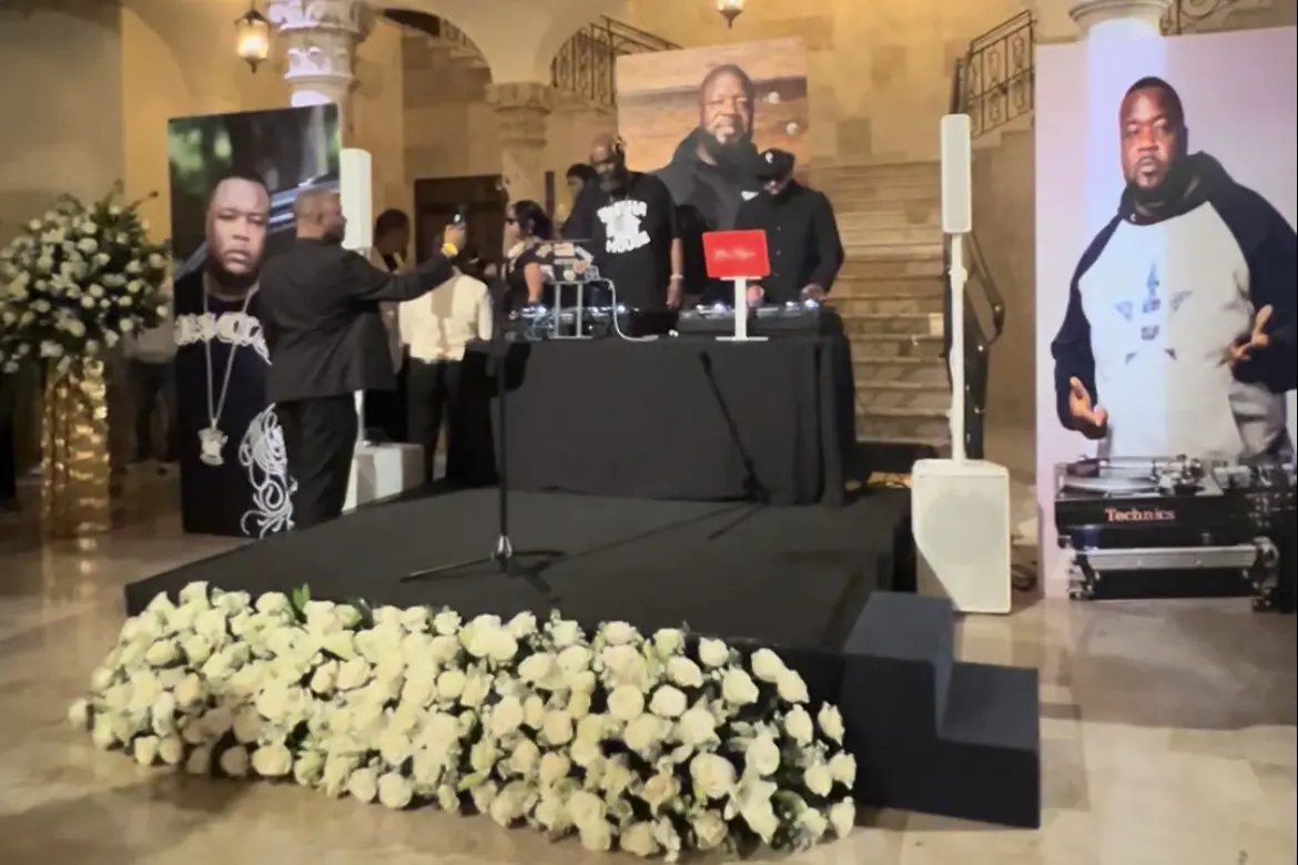 The celebration of life featured a DJ booth surrounded by large photos of Watts and music that reflected his influence on the city’s rap scene. Attendees wore coordinated black, gold, and white outfits to pay tribute to the late DJ and audio engineer.