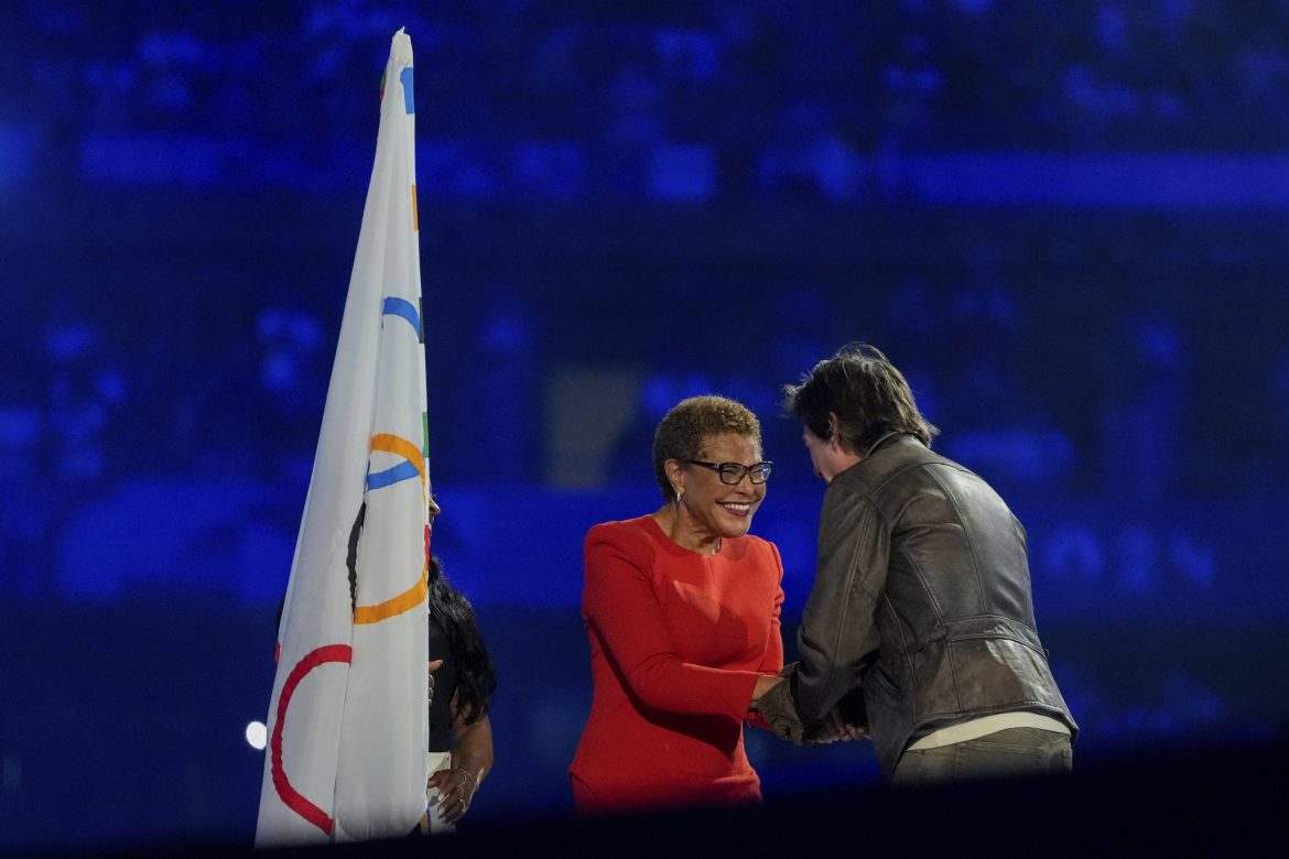 Tom Cruise greets Los Angeles Mayor Karen Bass during the 2024 Summer Olympics closing ceremony at the Stade de France, Sunday, Aug. 11, 2024, in Saint-Denis, France. (AP Photo/Natacha Pisarenko)