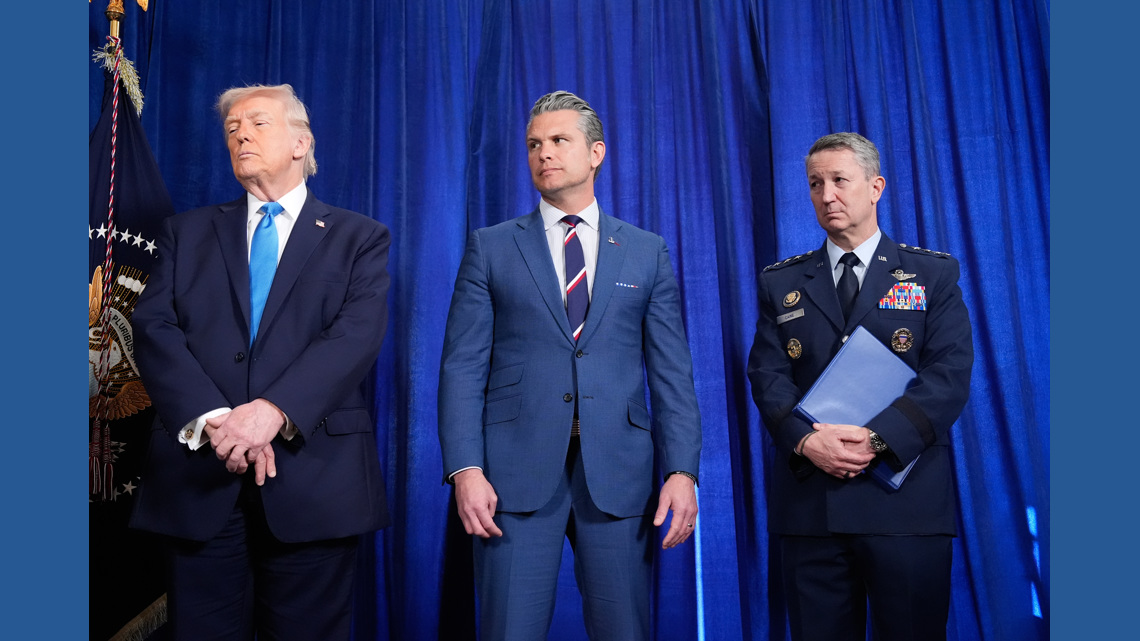 President Donald Trump, Defense Secretary Pete Hegseth and Chairman of the Joint Chiefs of Staff Gen. Dan Caine listen as Secretary of State Marco Rubio speaks during a news conference at Mar-a-Lago, Saturday, Jan. 3, 2026, in Palm Beach, Fla. (AP Photo/Alex Brandon)