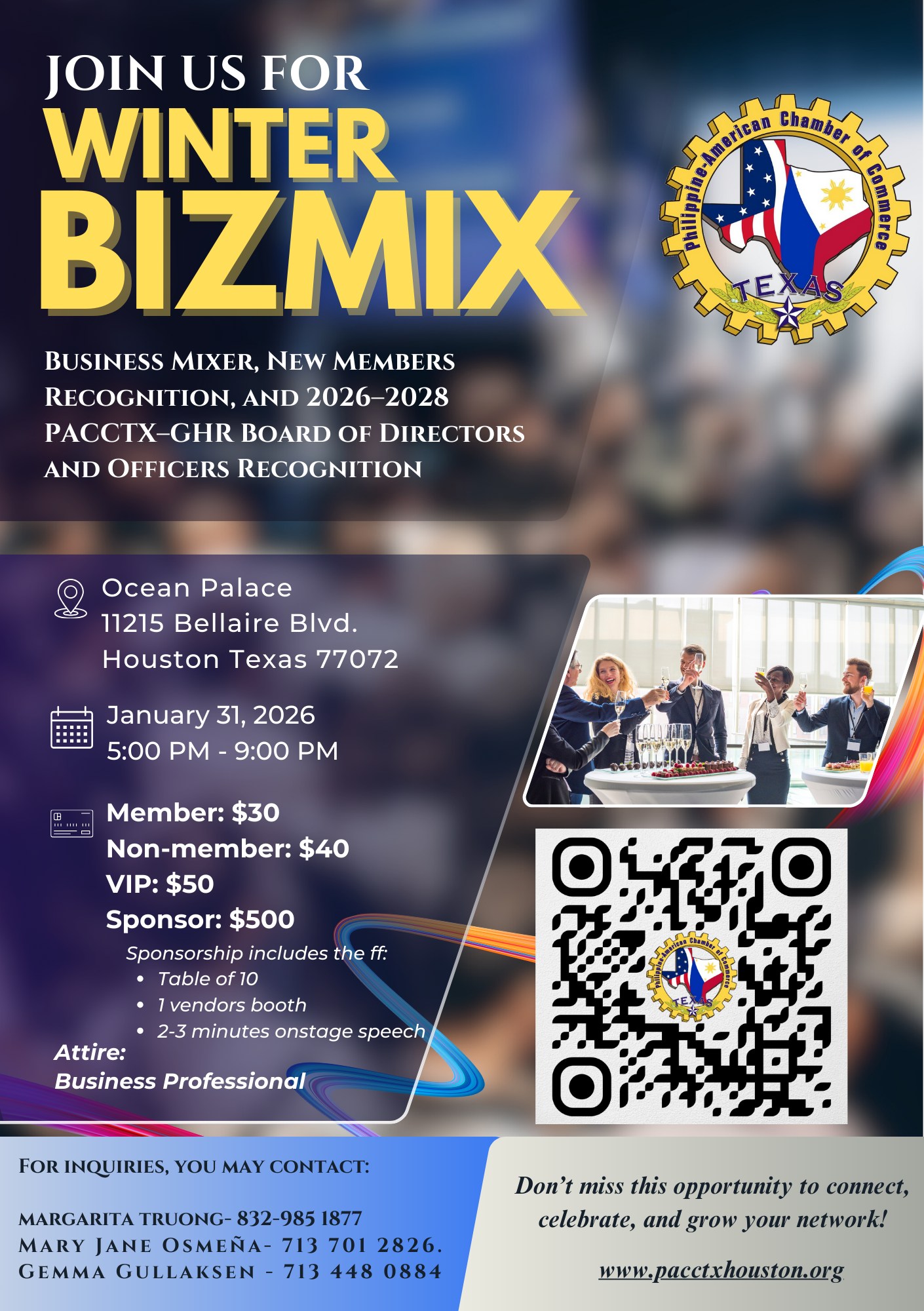 Houston, TX — The Philippine American Chamber of Commerce of Texas – Greater Houston Region (PACC Texas-GHR) is inviting all members, business partners, and professional networks to its first BizMix event of the year.