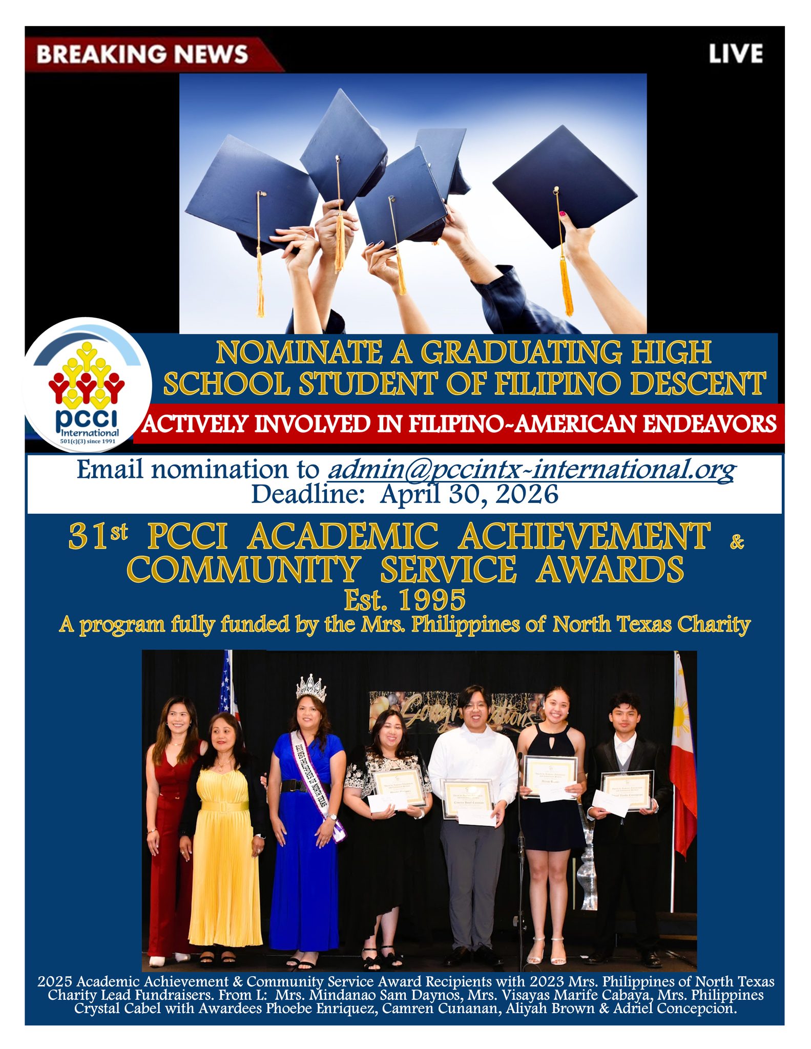 Dallas, TX – April 3, 2026 — The Philippine Community Center International (PCCI) is calling for nominations for its 31st Academic Achievement & Community Service Awards, a prestigious program that recognizes graduating high school students of Filipino descent actively involved in Filipino-American endeavors.