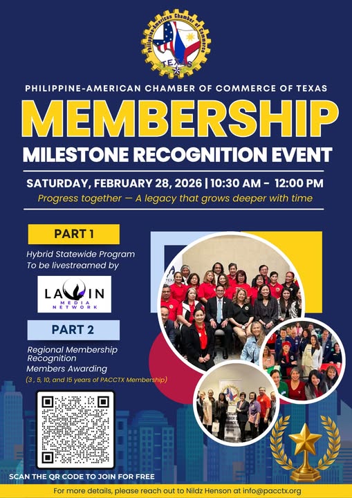 The Philippine-American Chamber of Commerce of Texas (PACCTX) will hold its Membership Milestone Recognition Event on Saturday, February 28, 2026, from 10:30 a.m. to 12:00 p.m., celebrating its founders and honoring members who have contributed to the organization’s growth over the years.