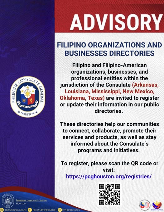 The initiative is open to entities operating in Arkansas, Louisiana, Mississippi, New Mexico, Oklahoma, and Texas. According to the Consulate, the Filipino Community Organizations and Businesses Directories serve as vital platforms for fostering connections, encouraging collaboration, and promoting services and products within the Filipino diaspora.