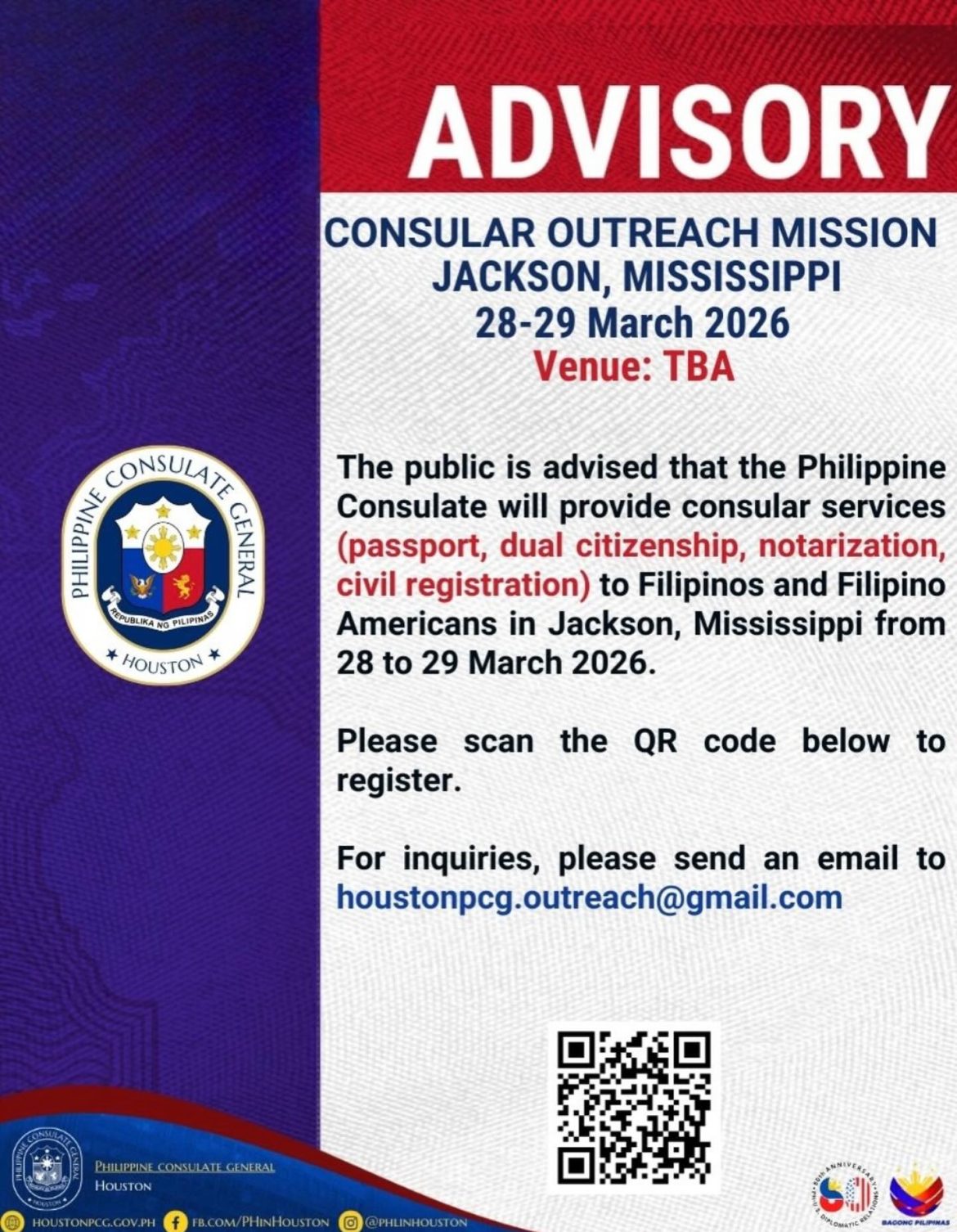 The Philippine Consulate General in Houston announced that it will conduct a consular outreach mission in Jackson, Mississippi on 28–29 March 2026. The mission aims to provide essential consular services to Filipinos and Filipino-Americans in Jackson and surrounding areas.