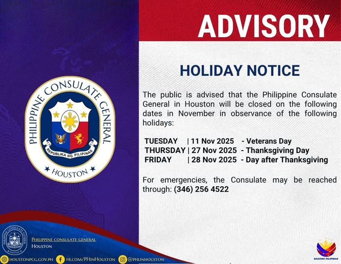HOUSTON, Texas — The Philippine Consulate General in Houston announced its closure on select dates in November in observance of U.S. federal holidays.