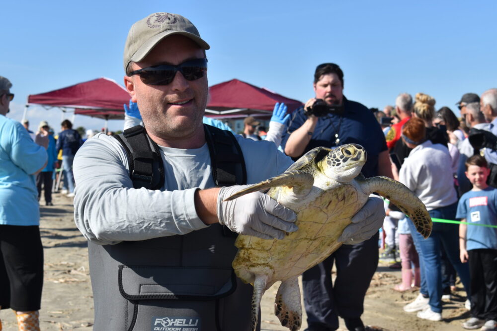 Volunteers carried 102 rehabilitated turtles into the water one at a time as onlookers cheered during the afternoon release. The animals had been saved days earlier after frigid temperatures left many in a cold-stunned state.