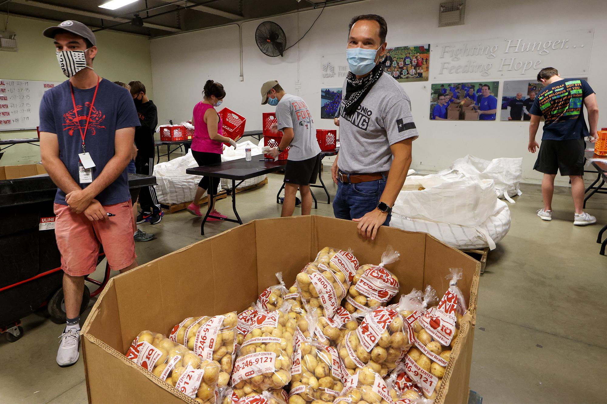 Eric Cooper, front right, President and CEO of the San Antonio Food Bank, stands in front of a box of bagged potatoes as volunteers wrap up their shift in the sorting room at the Food Bank on Wednesday, July 29, 2020.
