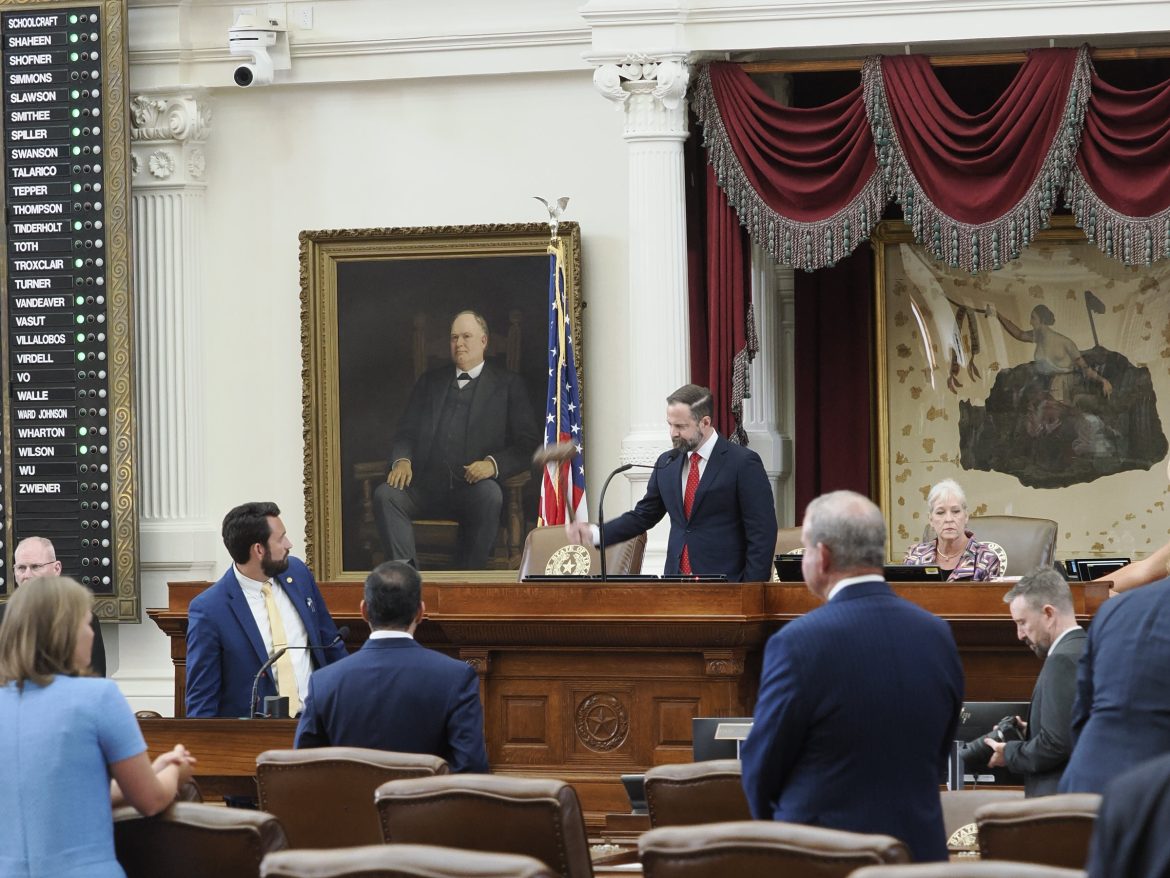 Texas House Speaker Dustin Burrows announces that the chamber is short of a quorum after Democrats left the state to temporarily block the redrawing of Texas congressional maps, Monday, Aug. 4, 2025, in Austin, Texas. (AP Photo/Michael Thomas)