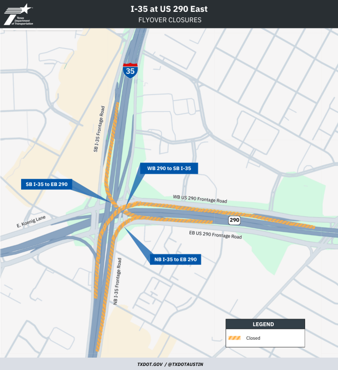 Texas Department of Transportation will temporarily close several flyovers at the interchange of Interstate 35 and US Highway 290 in Austin starting at 8 p.m. Tuesday for bridge joint repairs, with all lanes expected to reopen by 5 a.m. Wednesday.