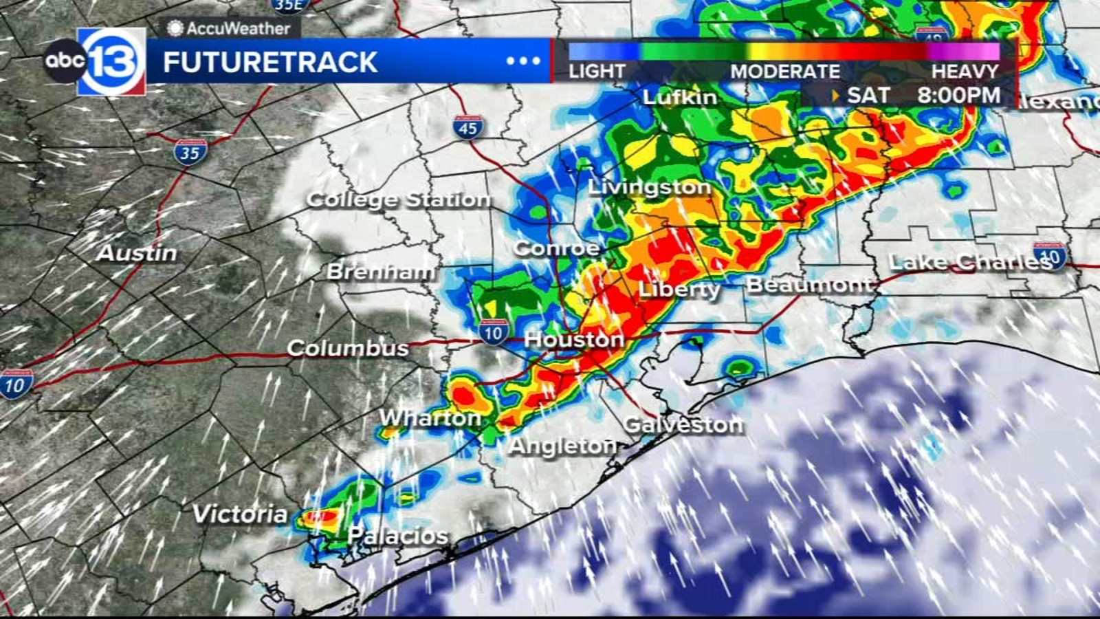 Weather models show the storm line reaching Brenham around 5 p.m., passing through downtown Houston at approximately 8 p.m., and moving toward Galveston by 10 p.m. The timing could affect a Mardi Gras parade scheduled for Saturday evening. Event organizers said the parade will proceed as planned but could face delays depending on conditions.